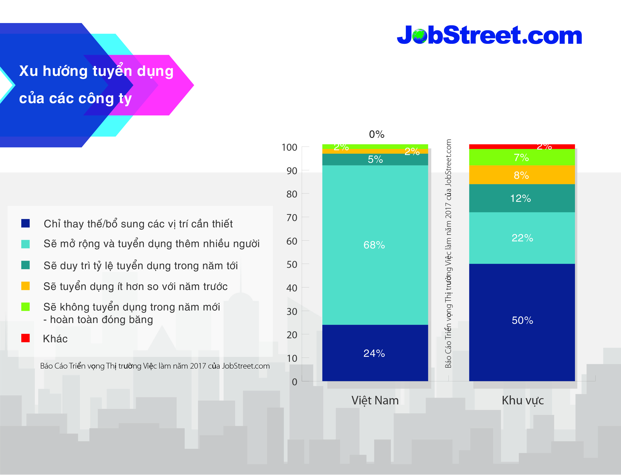 Cụ thể, 68% công ty ở Việt Nam dự định tăng nhân sự trong năm 2017, là xu hướng mở rộng thị trường lớn nhất khu vực. Đồng thời, cũng không có công ty nào có kế hoạch ngừng tuyển dụng trong năm 2017. Trong khi đó, tại Singapore, 20% công ty được hỏi cho biết họ có kế hoạch ngừng tuyển dụng trong năm nay, đứng đầu khu vực.
