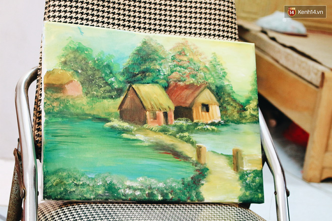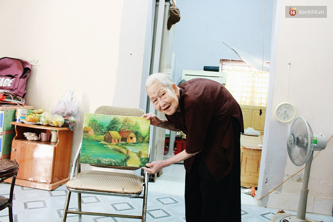 Cụ Thi đang ngắm nhìn bức tranh của chắt đích tôn.