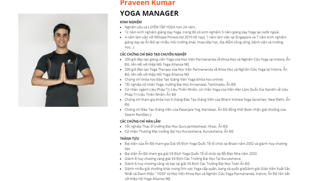HLV Praven Kumar đến từ Ấn Độ đã có kinh nghiệm nghiên cứu và tập luyện yoga hơn 24 năm. Trong 12 năm kinh nghiệm giảng dạy yoga, vị huấn luyện viên này đã có 5 năm giảng dạy yoga ở nước ngoài, 4 năm làm việc với N shape Fitness, 1 năm làm việc tại Singapore và 7 năm giảng dạy tại nhiều môi trường trên đất nước Ấn Độ. Huấn luyện viên Praven Kumar từng đạt các chứng chỉ đào tạo chuyên nghiệp tại Ấn Độ, Mỹ...