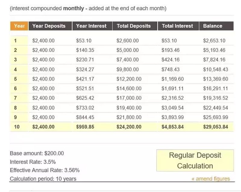 Đây là những gì bạn kiếm được sau 10 năm bằng cách tích lũy 200 USD mỗi tháng, lãi suất 3,5% và được gộp vào cuối mỗi tháng. Số tiền bạn có được sẽ là 29.053,84 USD.