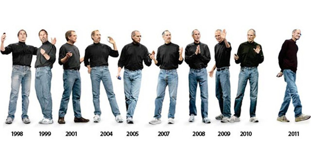 Ngoài quần jean xanh Levi's và giày hiệu New Balance thì hình ảnh Steve Jobs luôn luôn gắn bó với chiếc áo cổ rùa màu đen. Phong cách này được ông trung thành kể từ khi quay trở lại Apple và tới lúc mất, đến nỗi nhiều người có thể hiểu lầm là vị CEO giàu có này chỉ có... mỗi một bộ đồ mặc đi mặc lại!