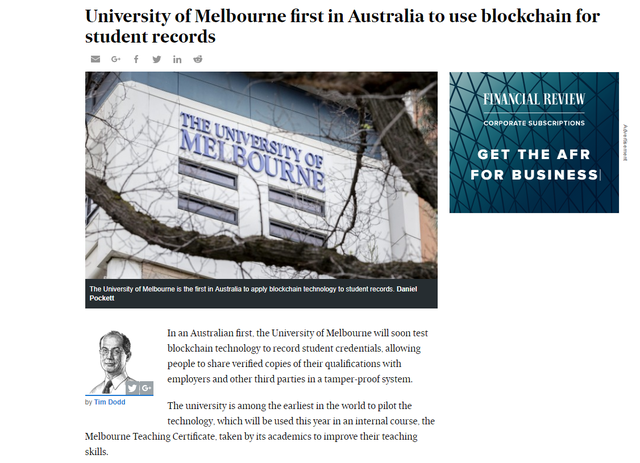 'Lần đầu tiên tại Australia, Đại học Melbourne sử dụng Blockchain để ghi nhận điểm số học sinh' - Australia chính là một trong số các nước đưa Blokchain vào giáo dục từ khá sớm